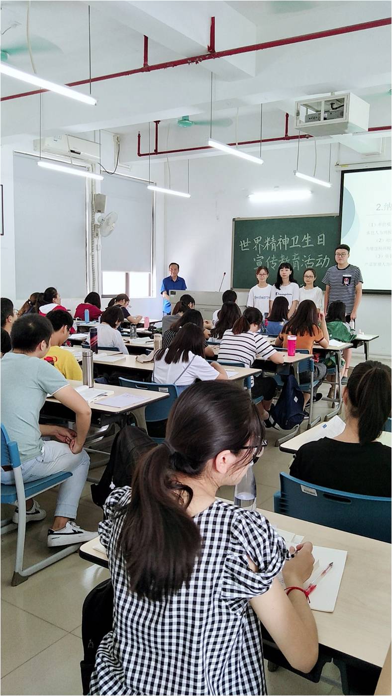 为了贯彻粤教体函(2018)71号文件精神,加强师生们对精神卫生教育重要性的认识,普及精神卫生和精神疾病知识,提高健康素养,促进师生的全面发展,我院于2018年10月9日上午课间二十分钟在北三教学楼403课室举办了以“师生健康,中国健康”为主题的世界精神卫生日宣传教育活动,并邀请了我院的石卫祥老师参与。