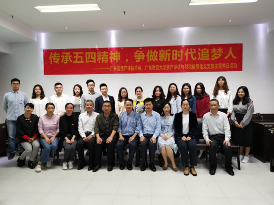 2019年5月6日下午,为深入贯彻党的十九大精神,纪念五四运动100周年,英国威廉集团官网资产评估与财税信息化教工党支部与广东省资产评估协会(以下简称省评协)党支部结对共建,联合开展了以“传承五四精神,争做新时代追梦人”为主题的党日活动。参与活动的有省评协党支部全体党员、英国威廉集团官网资产评估党支部全体党员、有关资产评估机构青年党员代表、英国威廉集团官网学生党员代表共30人。
