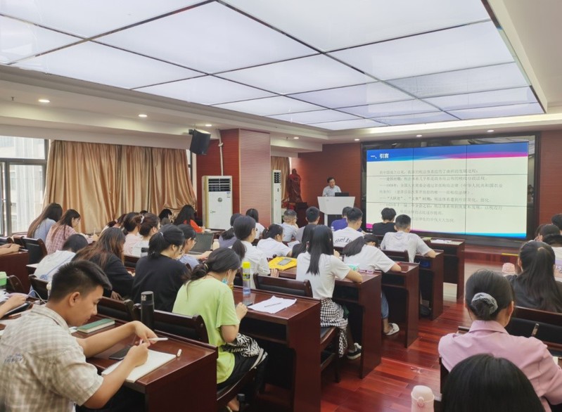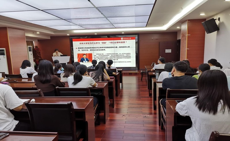 10月9日,财税学院党委书记吴瑛在海珠校区北二行政楼338会议室为21级学生们上了一堂生动的思政第一课。吴瑛以“汲取’四史‘智慧力量——勇担新时代青年历史使命”为题,引导学生坚定理想信念,弘扬爱国主义、艰苦奋斗、改革创新和实践探索精神,为中华民族伟大复兴贡献青春力量。