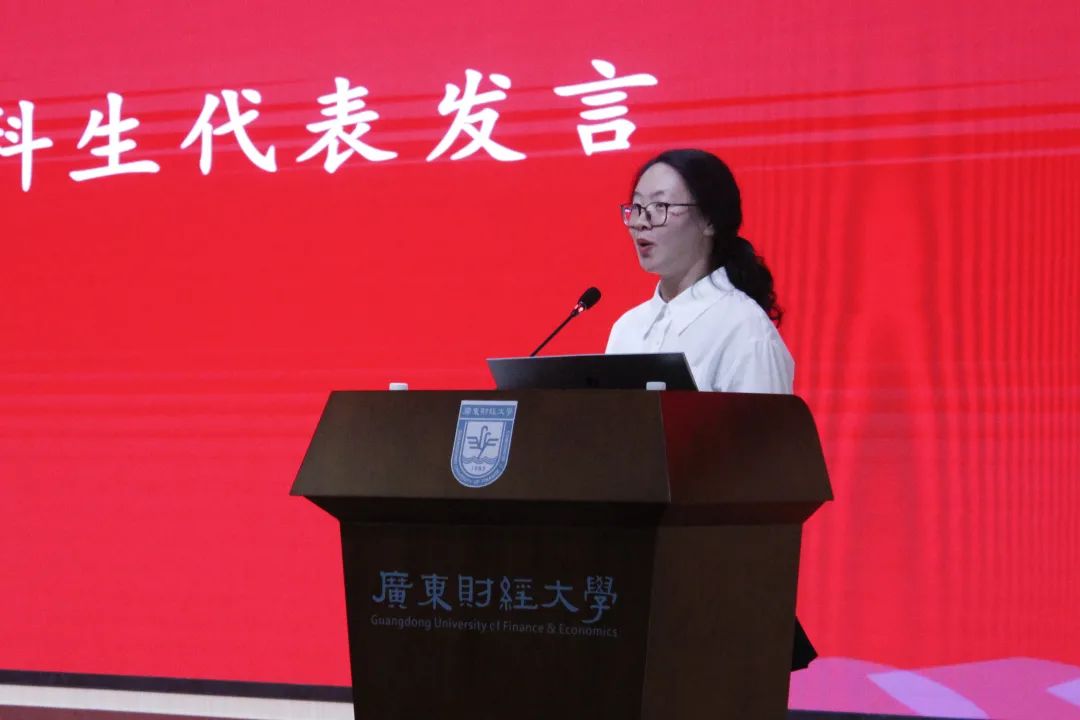 广州校区研究生南含月、本科生盛晴和佛山校区研究生余佳萱、本科生朱睿分别代表新生发言,她们倡议同学们恪守“厚德、励学、笃行、拓新”的校训,拥有上下求索的毅力,拿出乘风破浪的勇气,做奋进自律广财人。