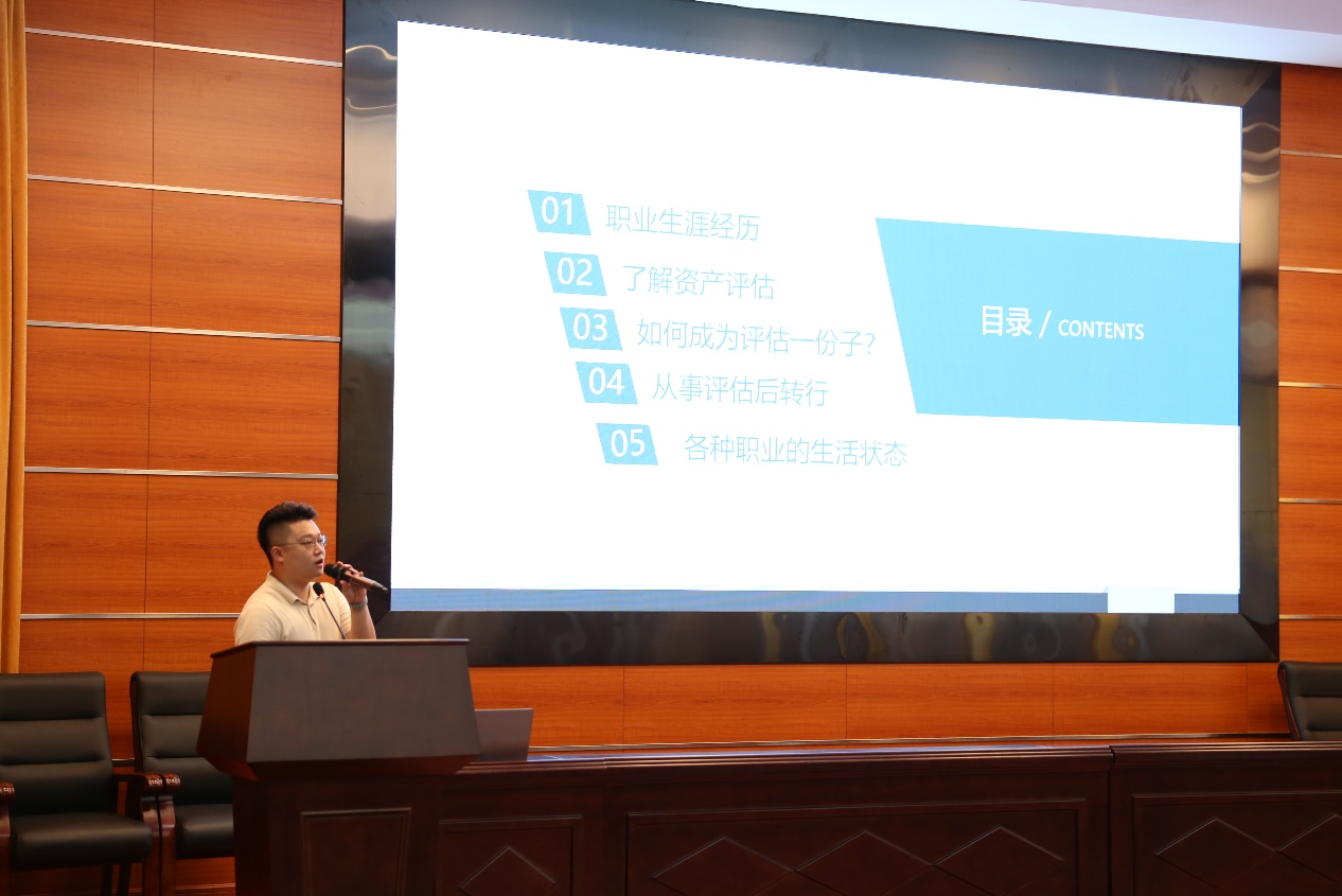 接下来是中联国际评估咨询有限公司的陈挚友经理宣讲,他也是我校资产评估专业的校友。他从职业生涯经历、了解资产评估、如何成为评估一份子、从事评估后转行和各职业的生活状态这五大方面为我们分享他的职业经验。
