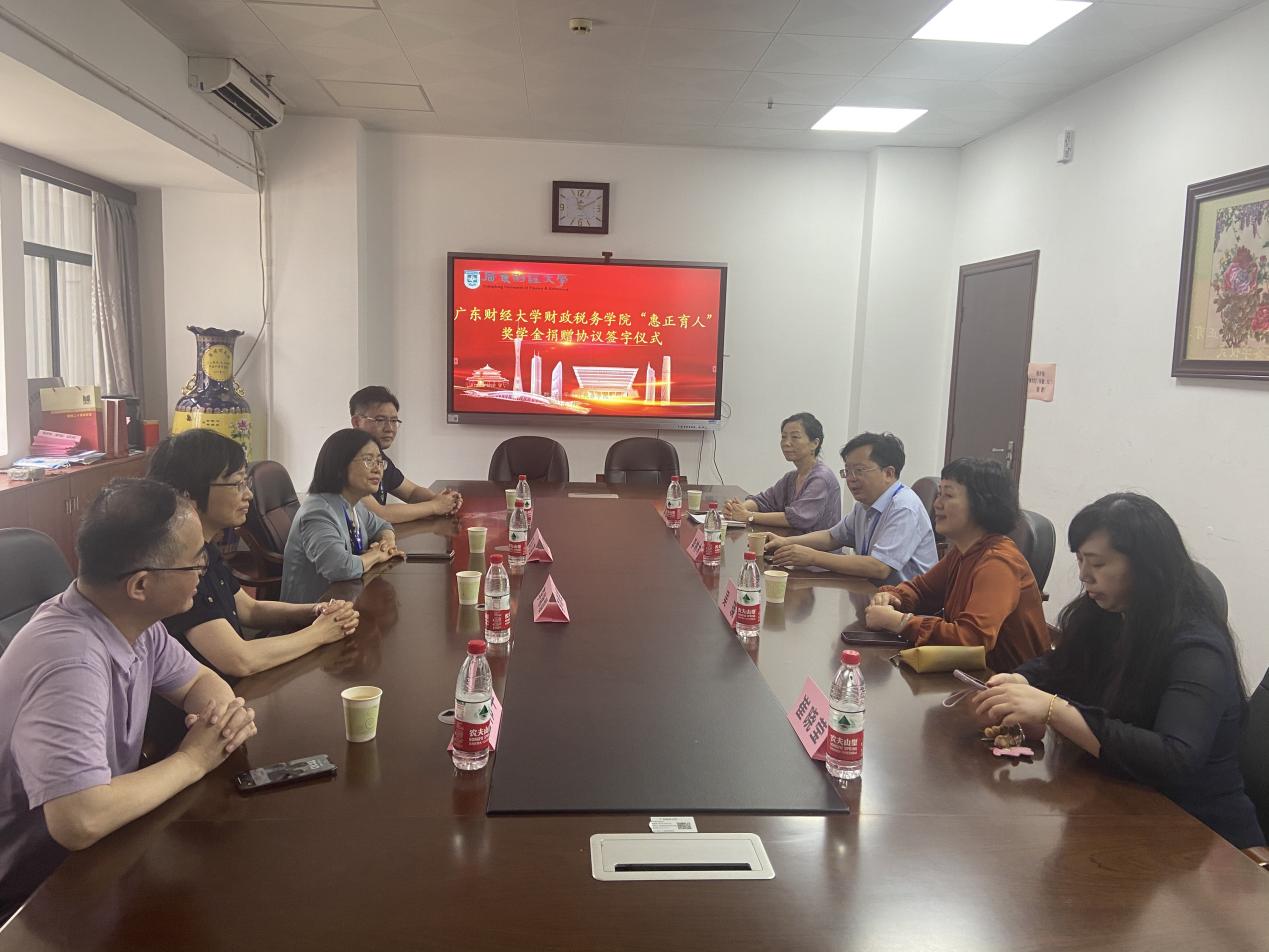 5月20日上午,“惠正育人”奖学金捐赠签约仪式在财政税务学院会议室举行。广东惠正资产评估与房地产土地估价有限公司(以下简称惠正公司)董事长郑心苗、常务副总经理兼财务总监李咏缨、副总经理王伟平、绩效评价与咨询评估技术总监徐贤韬、财政税务学院院长李林木、院党委书记吴瑛、副书记崔晓莹等参加了活动。签约捐赠仪式由财政税务学院副院长郑慧娟主持。