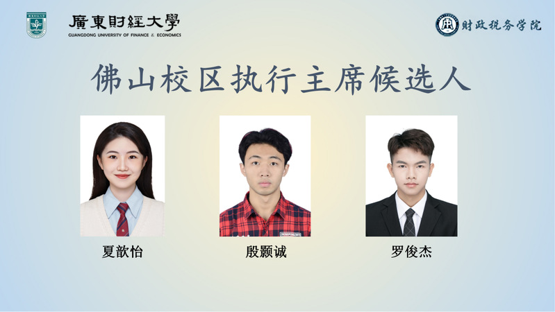 从四名主席团候选人差额选举中,吴晓旋、夏歆怡、殷颢诚三名同学预选成为新一届财政税务学院学生会主席团成员,待学院上报大会结果,由校团委审批后,最终确定新一届财政税务学院学生主席团成员。