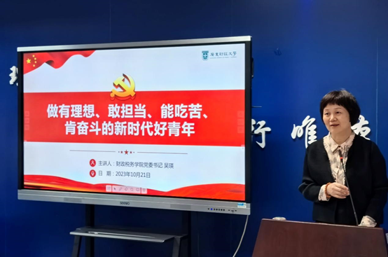 为了更好地学习贯彻习近平新时代中国特色社会主义思想,增进广大青年的奋斗意识,10月21日早上,财政税务学院党委书记吴瑛以“做有理想、敢担当、能吃苦、肯奋斗的新时代好青年”为主题,在广州校区立德楼330会议室为2021级、2022级入党积极分子和党员讲授思政第一课。