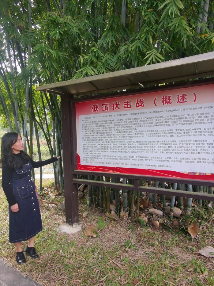 在低冚伏击战纪念公园,支部书记朱翠华以低冚伏击战为主题讲解了一场户外党课。1947年3月16日凌晨,黄柏带领增北部队、王达宏指挥龙南部队,两支队伍共50余人,悄悄地埋伏在低冚村一带,扎下口袋阵,一举歼灭县警中队80多人,成为龙门解放史上提振人心的重要一仗。