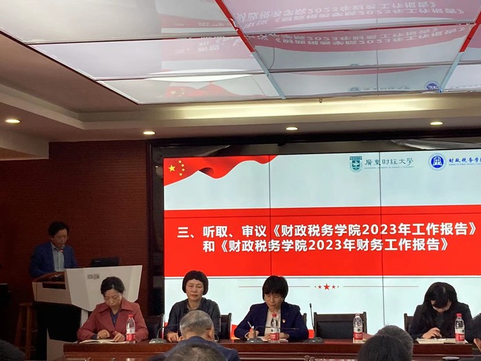 会议听取、审议了李林木院长的《2023年财政税务学院工作报告》和《2023年财政税务学院财务报告》,以及分工会主席姚雪绯的《2023年财政税务学院分工会工作报告》和《2023年财政税务学院分工会财务报告》,并一致通过了会议决议。会议认为,2023年,财政税务学院在校党委的坚强领导下,学院党委团结带领全体教职工,以习近平新时代中国特色社会主义思想为指导,落实高质量发展理念,在党的建设、人才培养、学科专业建设、科研与社会服务和四十周年校庆工作等方面取得了优异成绩;院工会团结带领教职工听党话跟党走,组织教职工参与学院民主管理,保障教职工合法权益,开展丰富多彩的暖人心、聚民心活动,取得了良好的成效。大会号召财政税务学院全体教职工在校党委的坚强领导下,在财税学院党委的带领下,团结奋斗,开拓创新,以“功成不必在我”的精神境界和“功成必定有我”的历史担当,共同谱写财政税务学院高质量发展新篇章。