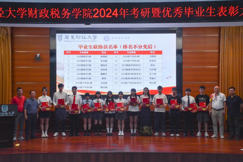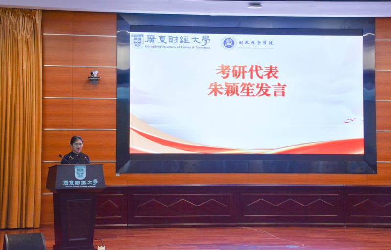 吴瑛书记宣读了学校关于优秀毕业生的表彰决定以及财政税务学院《关于表彰2024届考研先进个人的决定》,对2024届考取博士研究生的3名硕士毕业生和考取硕士研究生的41名本科毕业生予以表彰,同时财税校友基金会给予考取博士研究生的同学每人1000元的奖励,给予考取硕士研究生的同学每人500元的奖励。吴书记希望受表彰的同学,在今后的学习中再接再厉,勇攀知识高峰;同时号召全院学生向受表彰的同学学习,树立远大志向、刻苦钻研、勇于创新、积极进取,努力成为德才兼备、全面发展的高素质财税人才。