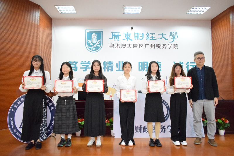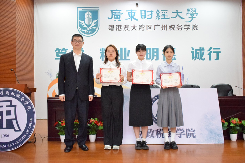 广东惠正资产评估与房地产土地估价有限公司副总经理罗子文、公司法规政策研究总监李海强为获奖同学颁发奖学金证书。