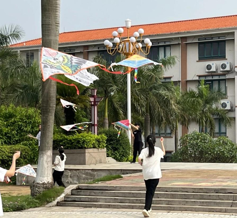 春光明媚,微风轻拂,老师与同学们移步室外,开启风筝放飞之旅。