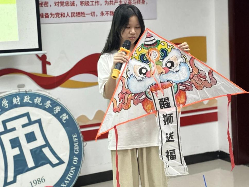 同学们踊跃上台展示自己的风筝作品,并分享自己的创作理念。第四组同学分享:“我们在风筝中画了醒狮。醒狮是岭南的民俗文化,它不仅是吉祥、平安和繁荣的象征,更代表着团结、奋进和创新的民族精神。作为新时代青年,我们应该用实际行动传承中华优秀传统文化。”