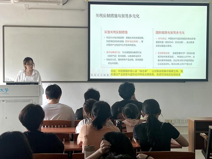 李乐瑶同学首先以"中美贸易摩擦的演进与现状"为主题,通过详实的数据和案例,向同学们展示了近年来美国对华加征关税的政策演变及其背后的战略意图。随后,李乐瑶系统讲解了中国政府的反制策略,包括对等加征关税、优化出口退税政策、扩大离境免税等财税工具的综合运用,并以海南离岛免税政策为例,生动说明了这些措施在促进消费回流、稳定外贸方面的显著成效。