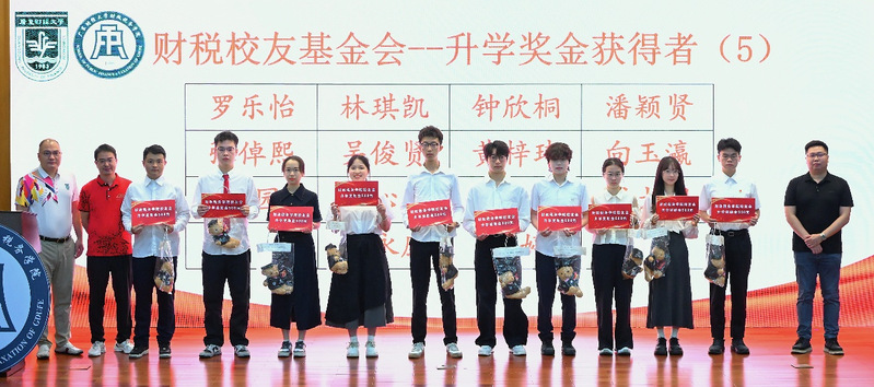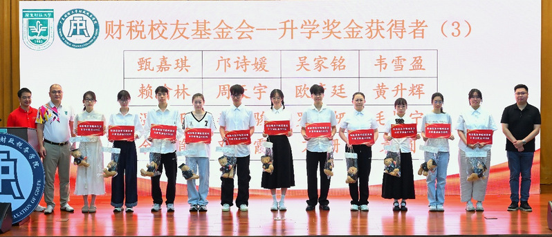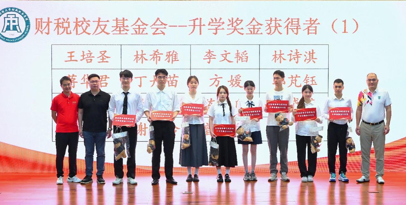 财政税务学院校友会执行会长邵建盛、黄博宇、曾金飞为升学毕业生颁发校友基金会奖金并赠送毕业礼物