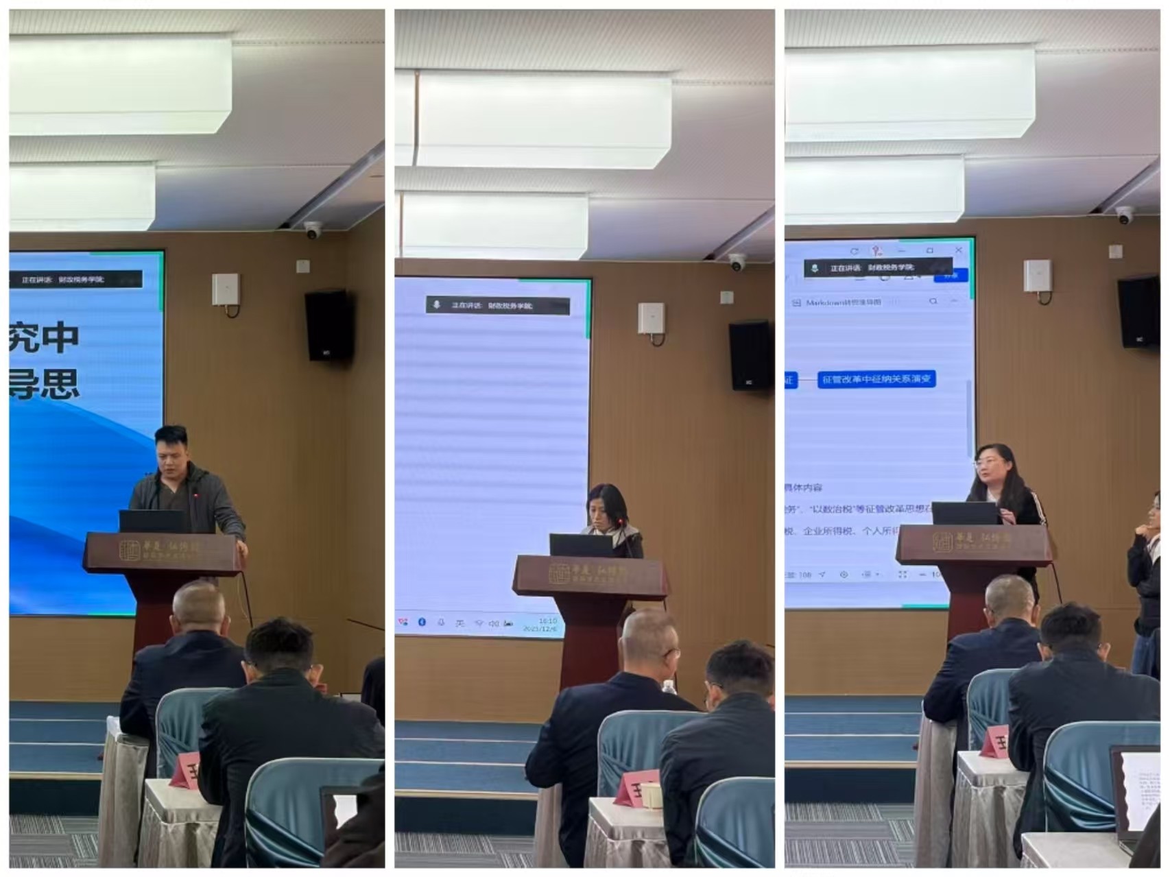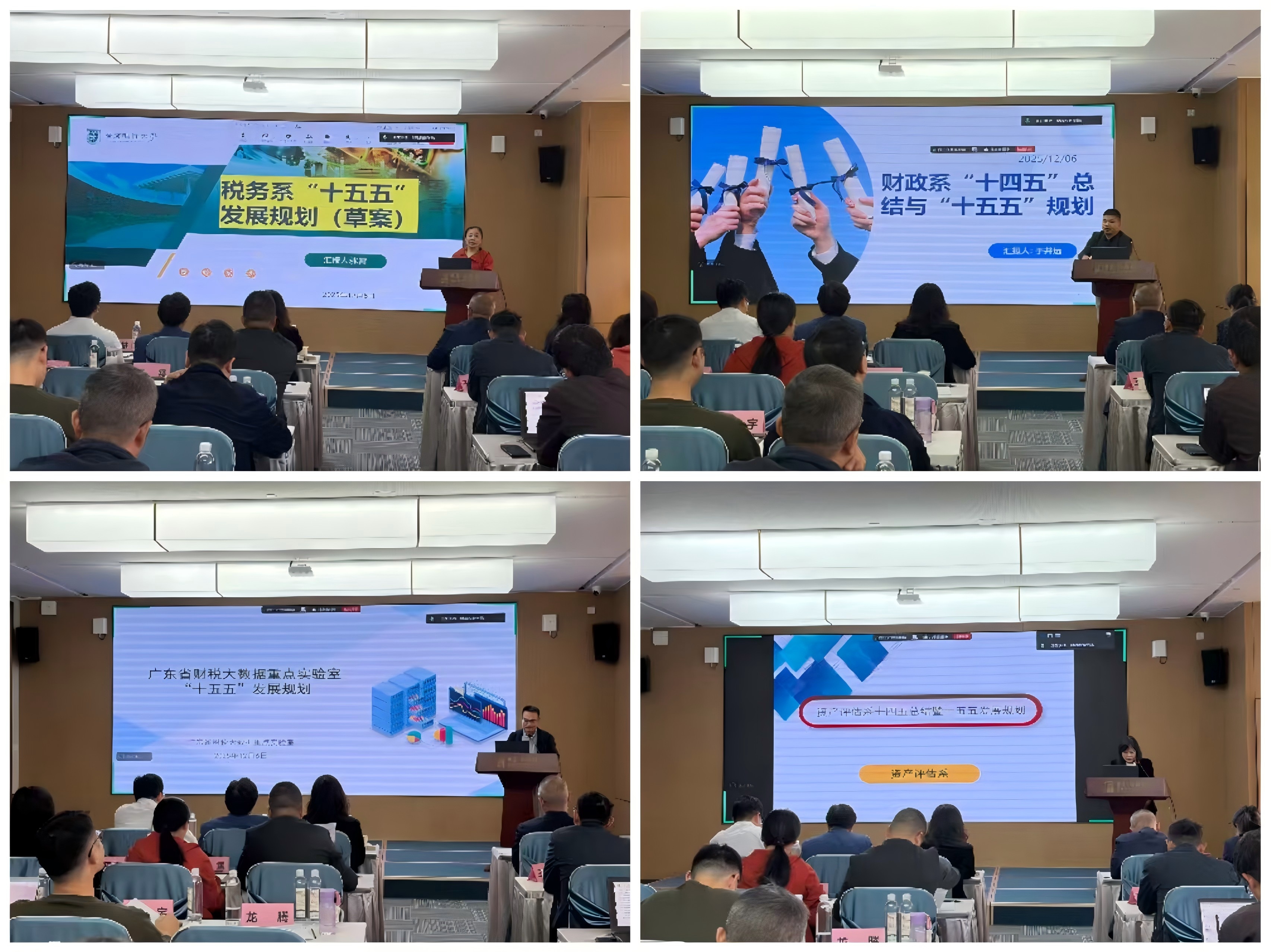 税务系主任张霄、财政系主任于井远、资产评估系主任韩丽娜、广东省财税大数据重点实验室副主任吴晔、广东地方公共财政研究中心副主任葛立宇、财税信息化实验室主任郭嘉仪、税务硕士教育中心主任方莉君分别就各个系室的“十四五”工作情况以及“十五五”发展规划作了主题报告。随后的分组讨论环节就学院和系室谋划和落实“十五五”发展规划以及学科建设、师资队伍建设、科研工作等进行研讨。